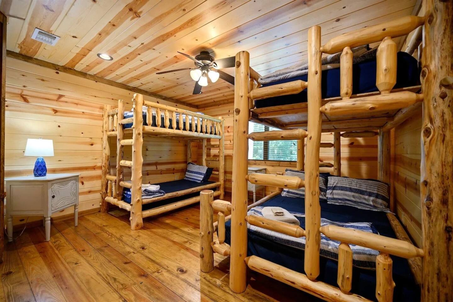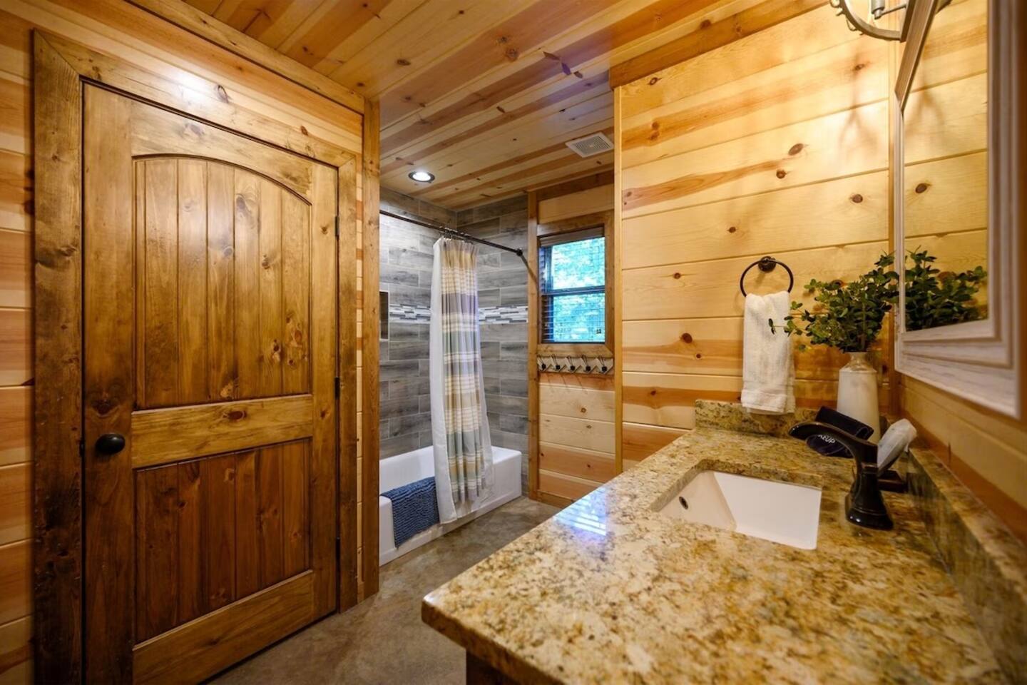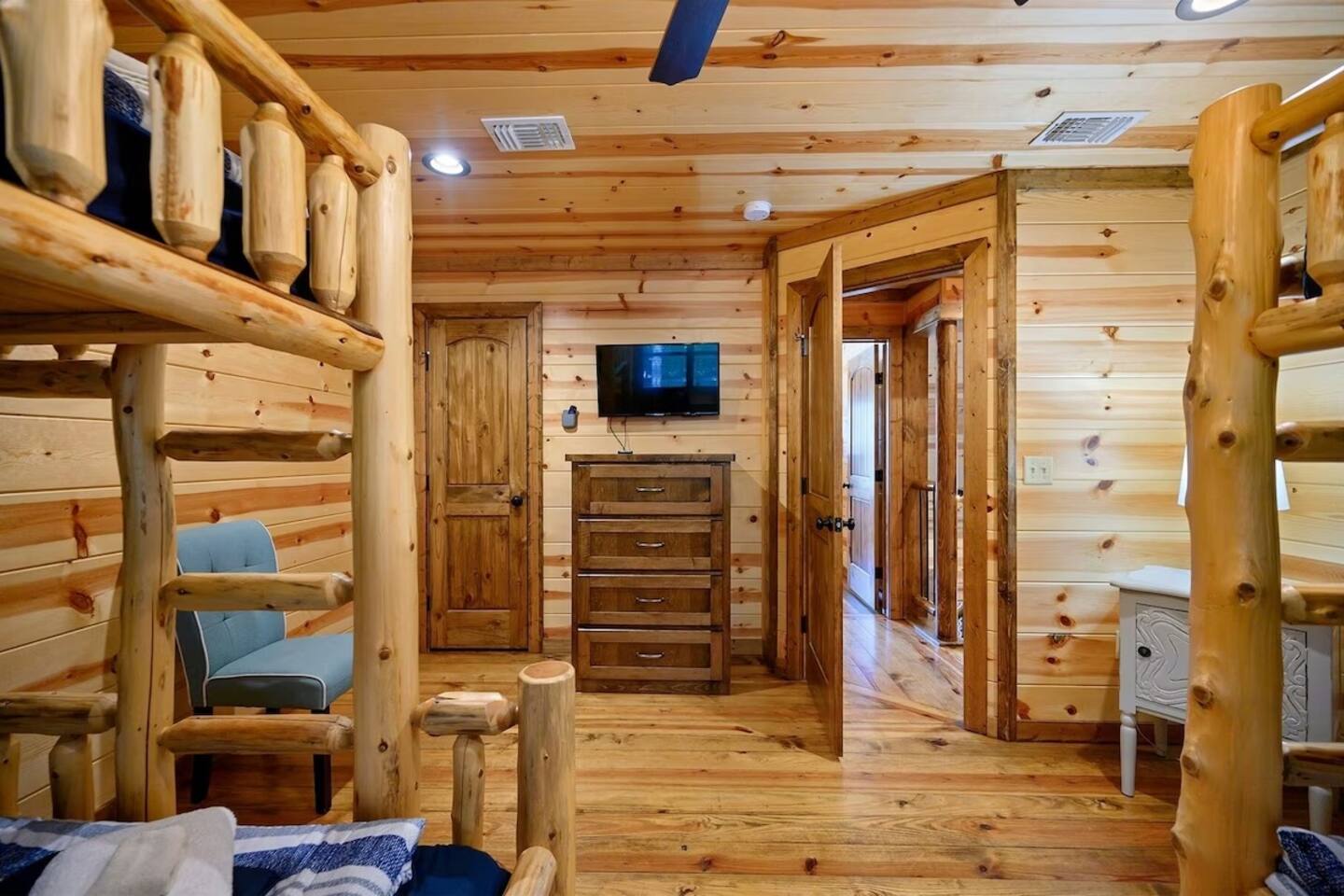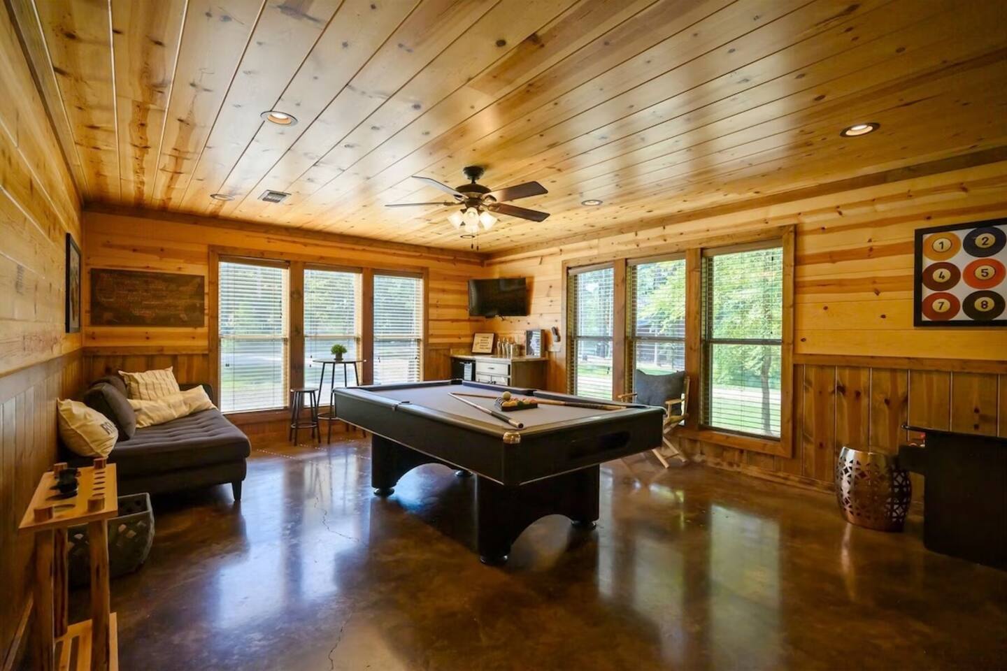 **THE LAYOUT:** 5 bedrooms, 4 baths, sleeps 14. King suites + bunk room. Game room. Hot tub. Fire pit. All on a wooded lot surrounded by pines. **BEDROOMS:** - Master suite — king bed, private bathroom - Bedroom 2 — king bed, private bathroom - Bedroom 3 — king bed, private bathroom - Bedroom 4 — king bed, shared bathroom - Bunk room — multiple bunks, perfect for kids or extra guests **LIVING & KITCHEN:** Open-concept living area with plenty of seating for the whole group. Fully equipped kitchen with everything you need to cook for a crowd — coffee maker, full-size fridge, oven, dishwasher, and all the basics (pots, pans, plates, utensils). Dining area seats the full group. **GAME ROOM:** Dedicated space for rainy days, late nights, and family tournaments. Your crew will spend more time here than you expect. **OUTDOOR SPACES:** - Private hot tub — soak under the stars surrounded by pines - Fire pit — bring marshmallows, we provide the seating - Spacious deck — morning coffee with nothing but trees and fresh air - Wooded lot — feels secluded, but minutes from everything **FULLY STOCKED BATHROOMS:** Every bathroom has shampoo, conditioner, body wash, hand soap, and fresh towels. Just pack your toothbrush. **EXTRAS:** - Keyless self check-in - High-speed WiFi - Washer and dryer - Pet-friendly (let us know in advance)