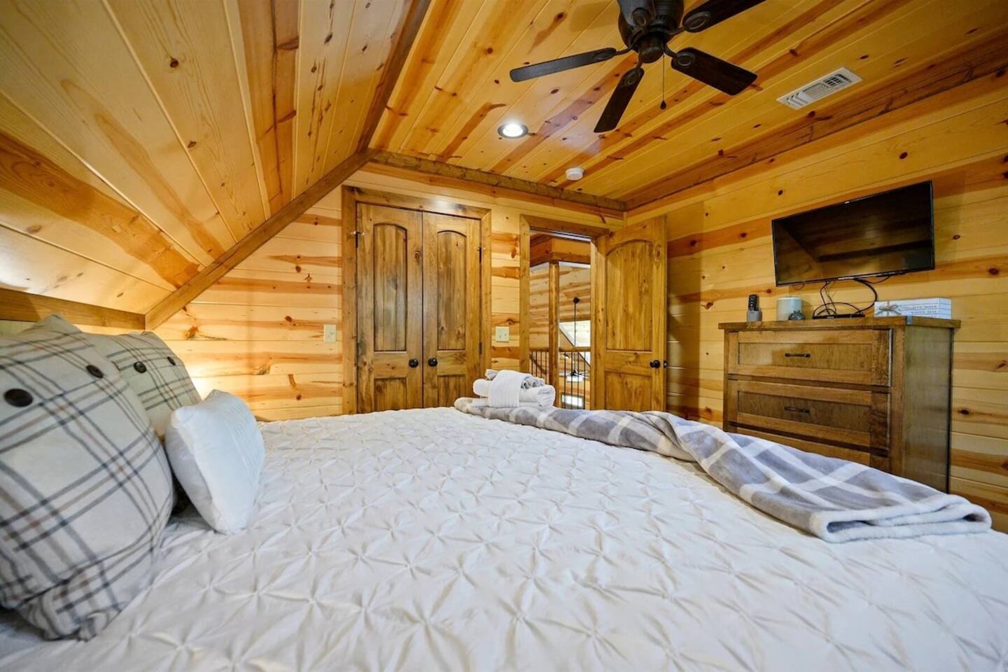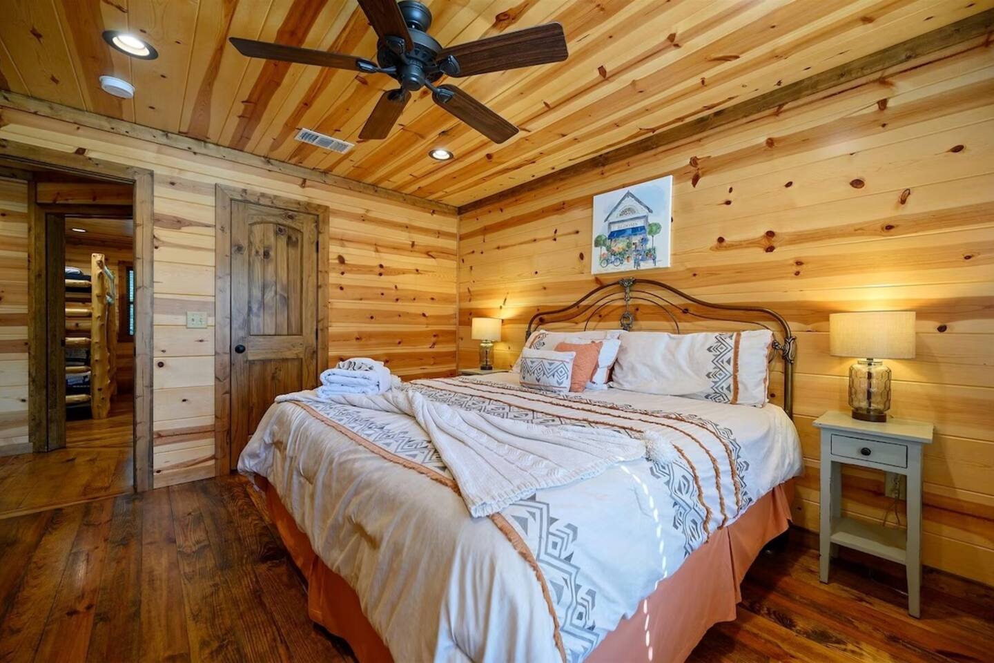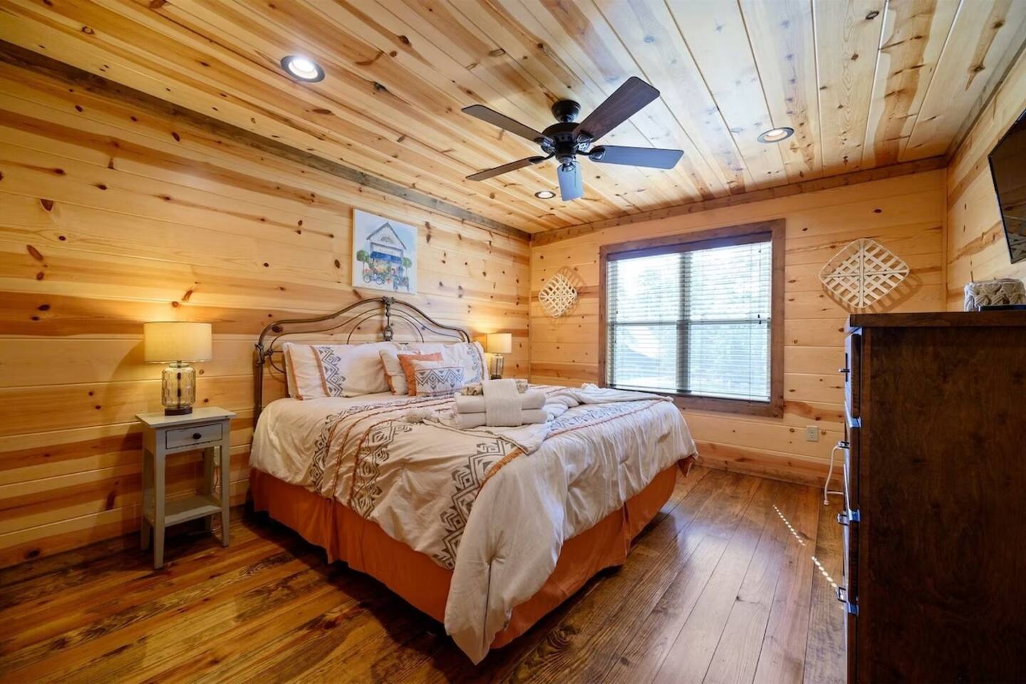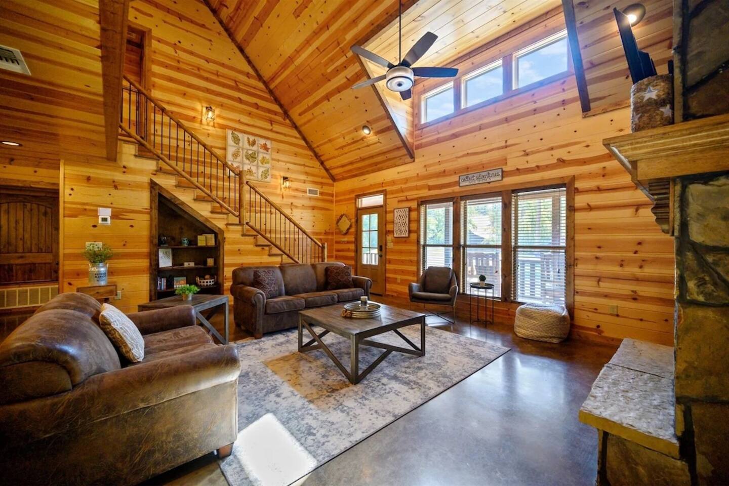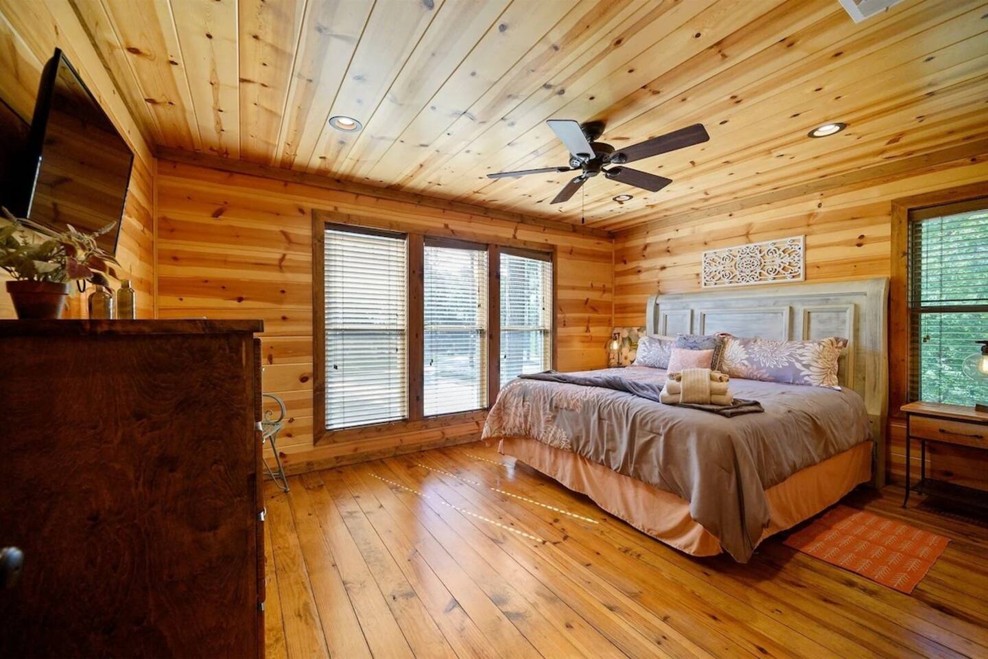 **THE LAYOUT:** 5 bedrooms, 4 baths, sleeps 14. King suites + bunk room. Game room. Hot tub. Fire pit. All on a wooded lot surrounded by pines. **BEDROOMS:** - Master suite — king bed, private bathroom - Bedroom 2 — king bed, private bathroom - Bedroom 3 — king bed, private bathroom - Bedroom 4 — king bed, shared bathroom - Bunk room — multiple bunks, perfect for kids or extra guests **LIVING & KITCHEN:** Open-concept living area with plenty of seating for the whole group. Fully equipped kitchen with everything you need to cook for a crowd — coffee maker, full-size fridge, oven, dishwasher, and all the basics (pots, pans, plates, utensils). Dining area seats the full group. **GAME ROOM:** Dedicated space for rainy days, late nights, and family tournaments. Your crew will spend more time here than you expect. **OUTDOOR SPACES:** - Private hot tub — soak under the stars surrounded by pines - Fire pit — bring marshmallows, we provide the seating - Spacious deck — morning coffee with nothing but trees and fresh air - Wooded lot — feels secluded, but minutes from everything **FULLY STOCKED BATHROOMS:** Every bathroom has shampoo, conditioner, body wash, hand soap, and fresh towels. Just pack your toothbrush. **EXTRAS:** - Keyless self check-in - High-speed WiFi - Washer and dryer - Pet-friendly (let us know in advance)